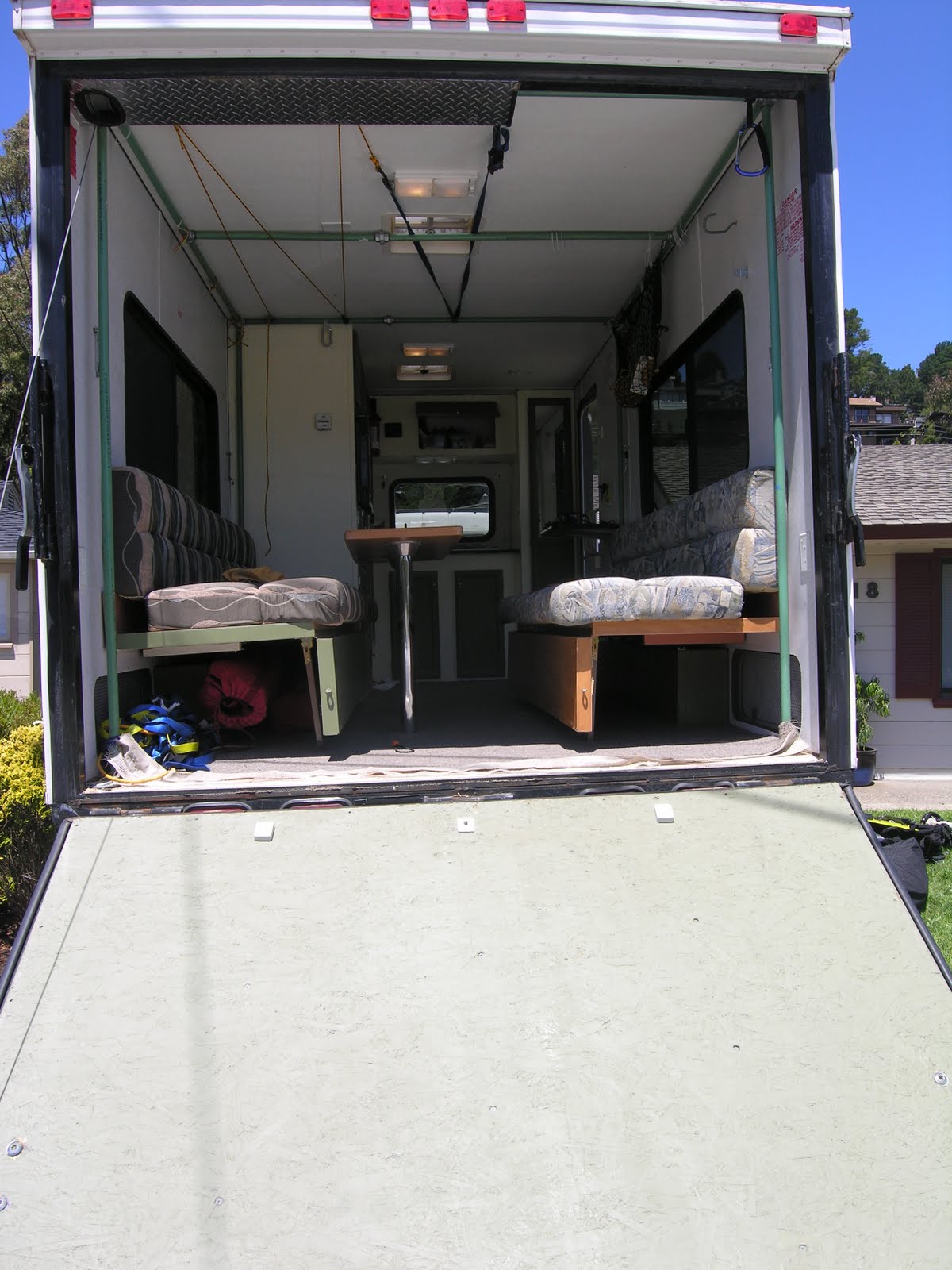 - Two couches that fold-down into beds, or fold flush to the walls for hauling motorcylces and gear.
